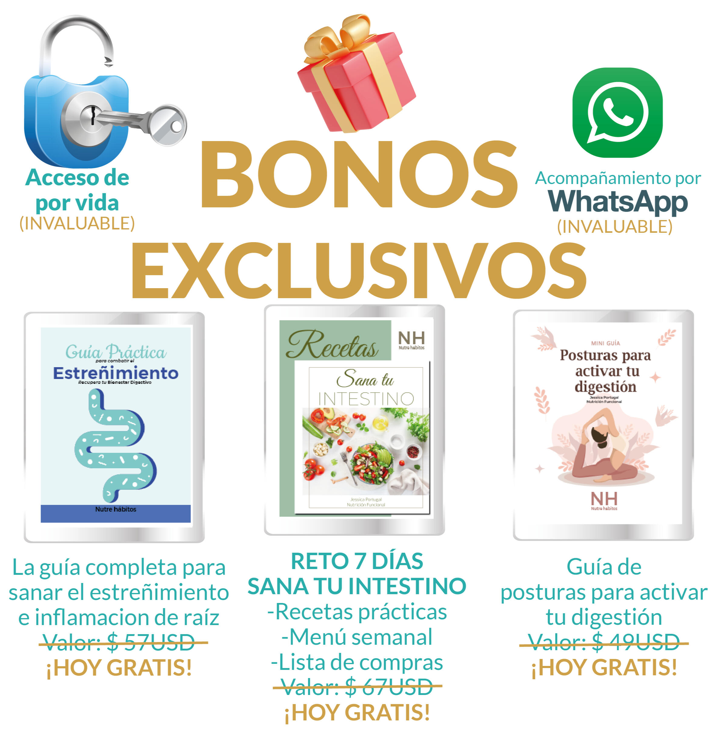 Quiero que tengas todo lo que necesitas para sanar tu intestino desde adentro, y por eso te llevas estos bonos de regalo si te inscribes HOY MISMO: