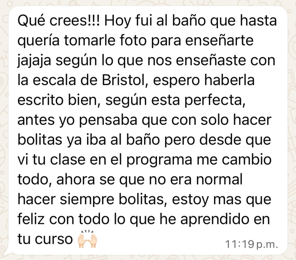 💬 Yo pensaba que con solo hacer bolitas ya iba al baño, desde que vi tu clase en el programa me cambio todo.